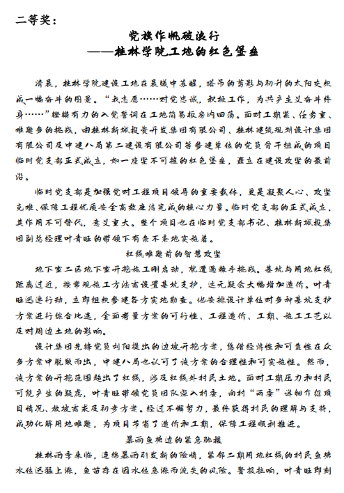 二等獎(jiǎng):唐際晴《黨旗作帆破浪行——桂林學(xué)院工地的紅色堡壘》