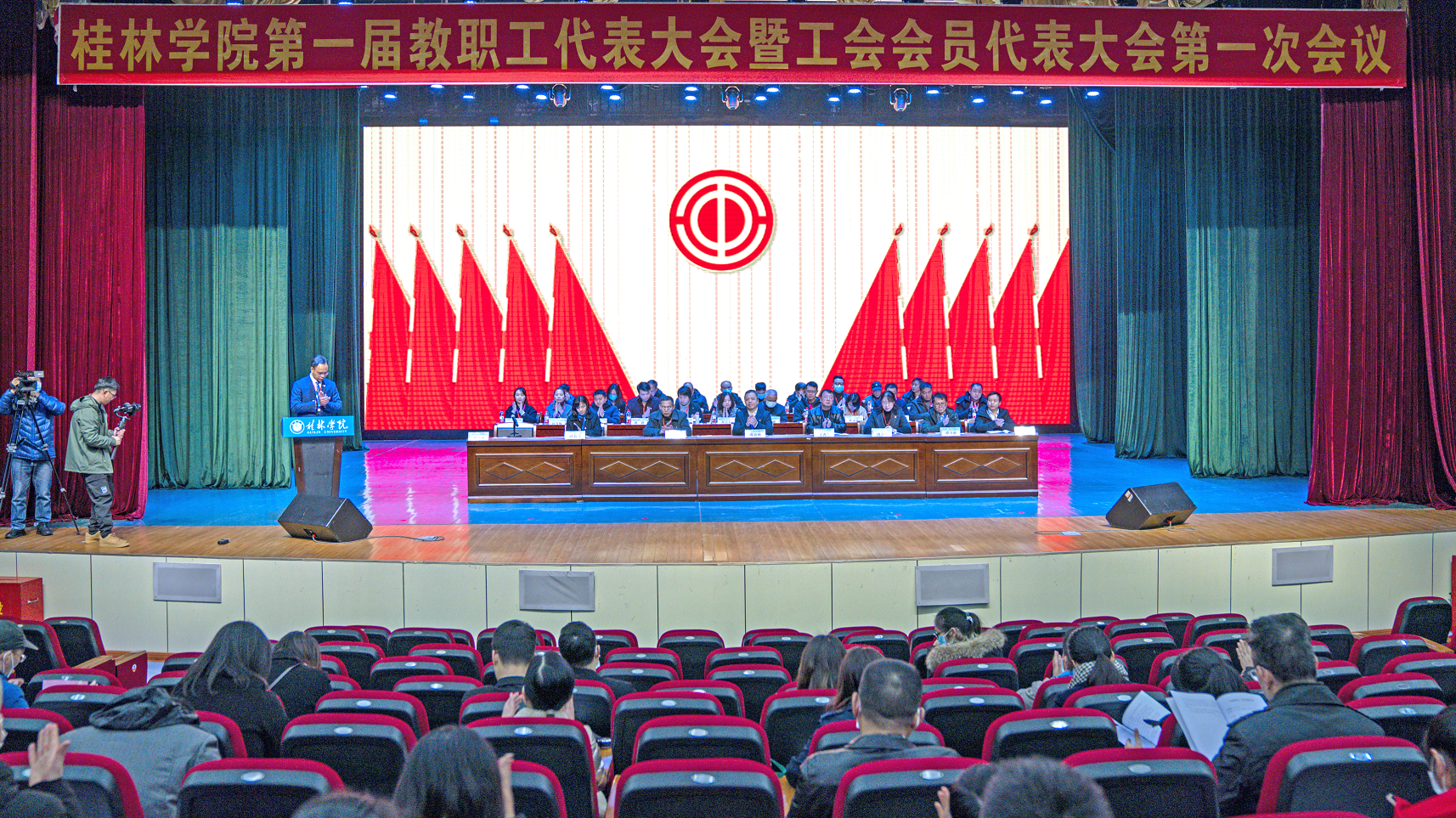 2022年1月15日上午,桂林學(xué)院第一屆教職工代表大會(huì)暨工會(huì)會(huì)員代表大會(huì)第一次會(huì)議在學(xué)校弘善講堂召開(kāi)。市總工會(huì)黨組成員、副主席、教育工會(huì)主席莫曦媛,市教育工會(huì)常務(wù)副主席陳東,新城投資集團(tuán)黨總支書(shū)記、董事長(zhǎng)、桂林學(xué)院董事長(zhǎng)周道林,新城投資集團(tuán)副總經(jīng)理、桂林學(xué)院副董事長(zhǎng)鄭善華出席會(huì)議。桂林學(xué)院校長(zhǎng)楊樹(shù)喆等大會(huì)主席團(tuán)成員在主席臺(tái)就座。桂林學(xué)院黨組織負(fù)責(zé)人唐文紅主持會(huì)議。正式代表、特邀代表、列席代表近150人參加大會(huì)。