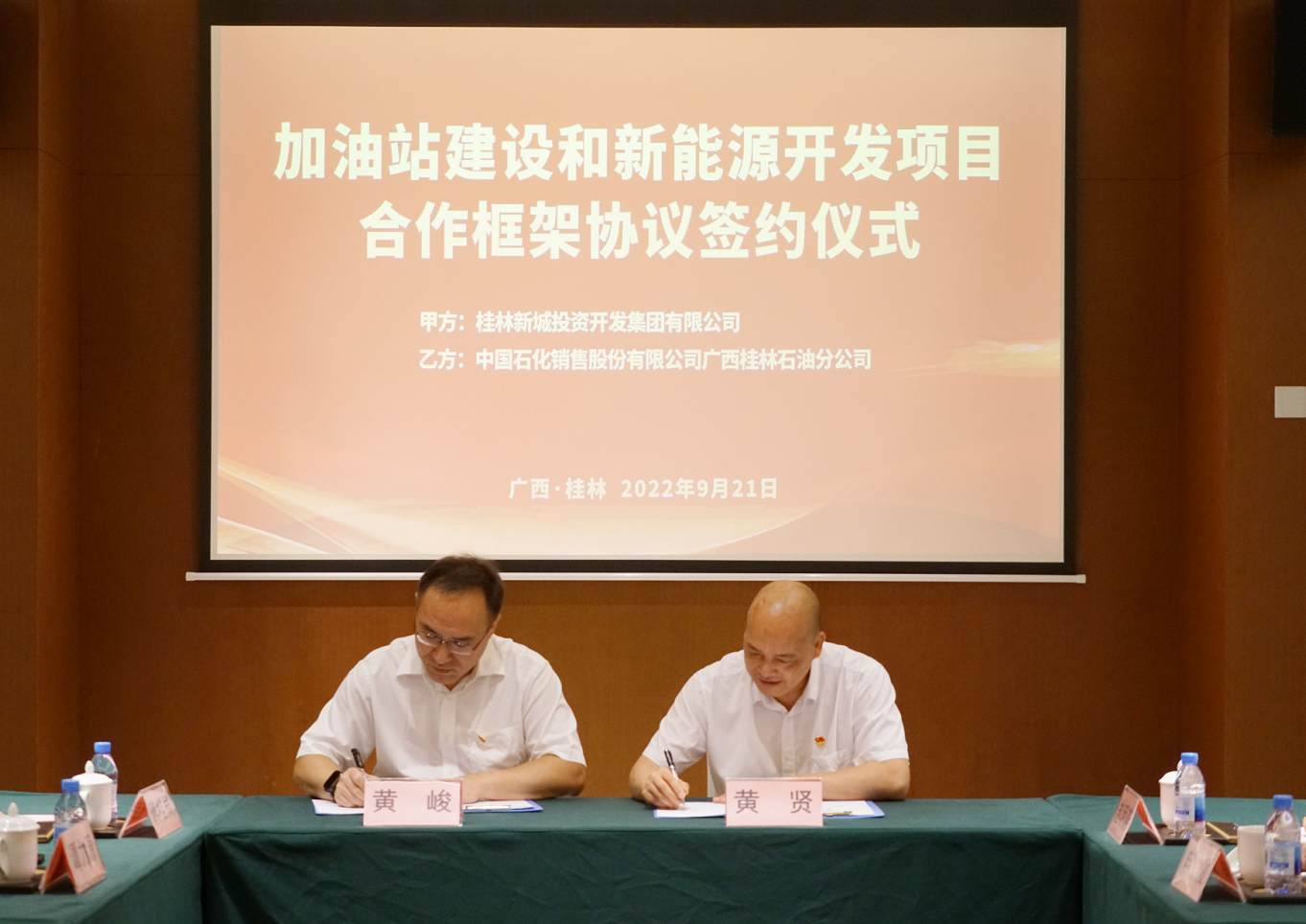 2022年9月21日,桂林新城投資開發(fā)集團有限公司(以下簡稱新城投集團)與中國石化銷售股份有限公司廣西桂林石油分公司(以下簡稱中石化桂林分公司)在桂林宏謀大酒店舉行桂林新區(qū)加油站建設(shè)和新能源開發(fā)項目合作框架協(xié)議簽約儀式。臨桂新區(qū)黨工委委員、管委會常務(wù)副主任李星明,黨工委委員、管委會副主任張慧慶,新城投集團黨總支副書記、總經(jīng)理黃峻,中石化桂林分公司總經(jīng)理黃賢出席簽約儀式。簽約儀式由新城投集團副總經(jīng)理吳濤主持。
