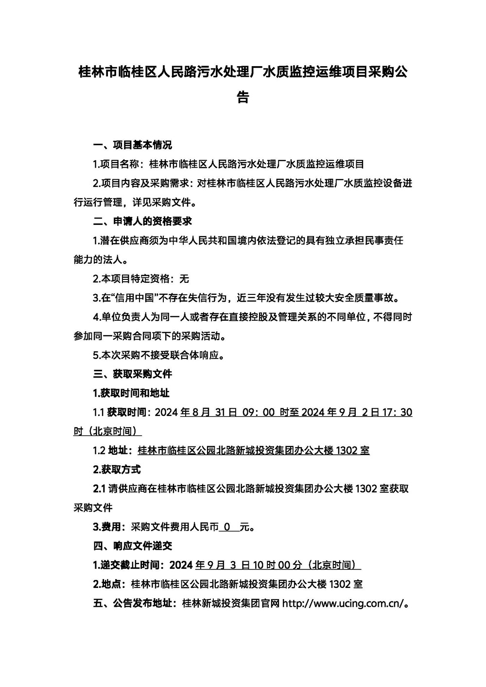 桂林市臨桂區(qū)人民路污水處理廠水質(zhì)監(jiān)控運維項目采購公告