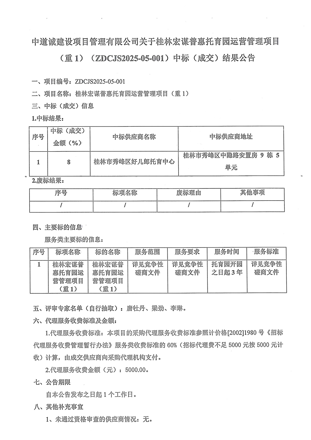 中道誠建設(shè)項目管理有限公司關(guān)于桂林宏謀普惠托育園運營管理項目(重1)(ZDCJS2025-05-001)中標(biāo)(成交)結(jié)果公告