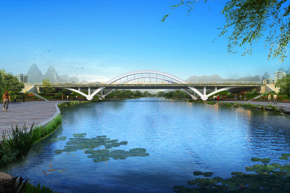 萬平橋位于萬平路與西城大道交叉口西側(cè),橫跨中心環(huán)形河水域,是目前臨桂新區(qū)所有橋梁當中,投資最大、結(jié)構(gòu)最復雜、施工難度最大的一座橋梁。橋梁設(shè)計為中承式飛燕拱橋,采用Y構(gòu)鋼管混凝土拱橋組合體系,外觀新穎獨特,顏色鮮明亮麗,橋長123m,橋面寬度60m,全橋分左右兩幅,每幅橋在人行道及中央分隔帶處各設(shè)置拱肋,共設(shè)4道拱肋、28根吊桿。
